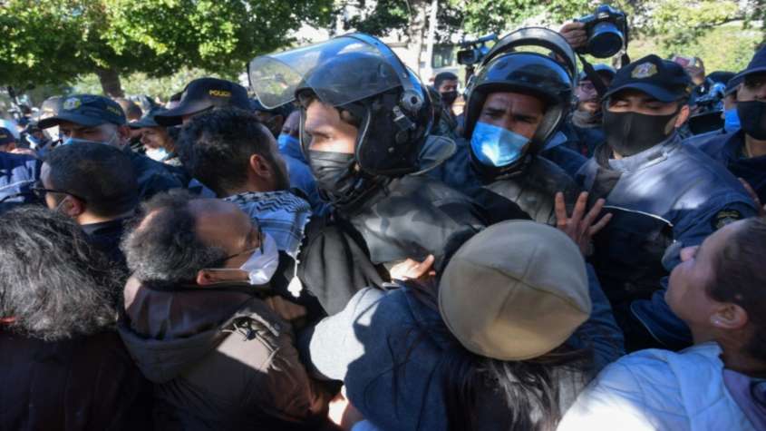 وانطلق المحتجون من “ساحة حقوق الانسان” ووصلوا الى شارع الحبيب بورقيبة، غير ان قوات الأمن المنتشرة منعتهم من الوصول الى الجزء الذي فيه مقر وزارة الداخلية، على ما أفاد مراسل فرانس برس.